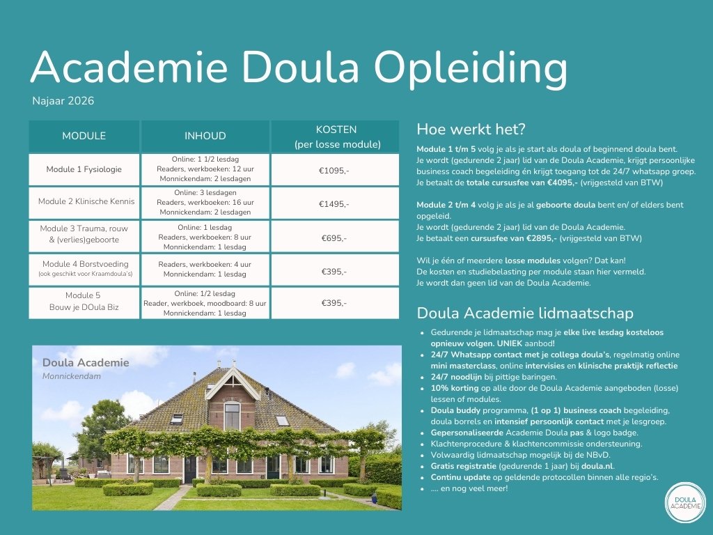 Als je begint als doula of nog onzeker bent over je eerder opgedane kennis dan is de complete Academie Doula opleiding voor jou. Je volgt modules 1 t/m 5 en geniet van vele extra's als lid van de Doula Academie. Kom thuis op de Kloosterdijk.