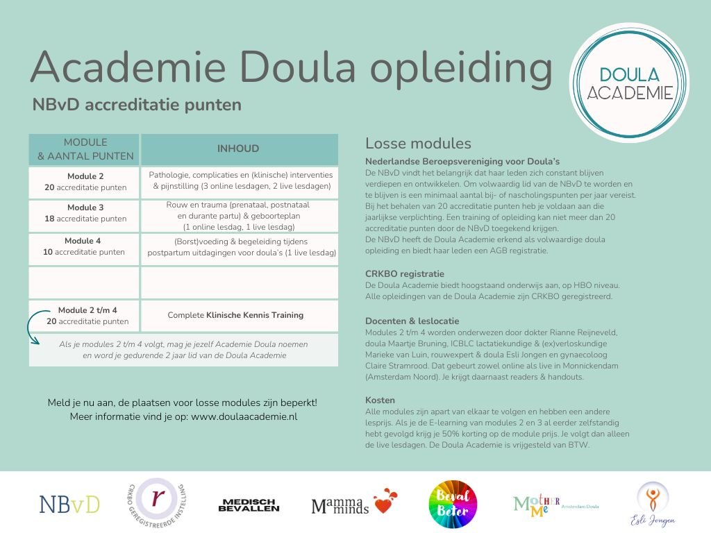 In 2024 hebben we de geboorte doula opleiding vernieuwd en een arts en een gynaecoloog aan ons docenten team toegevoegd. We zijn trots op onze hybride onderwijsvorm, waarmee je thuis op je eigen tempo studeert en tijdens de live lesdagen direct praktisch aan de slag kan! Daarnaast zijn we erkend als CRKBO geregistreerde instelling dus onze prijzen zijn niet alleen vrijgesteld van BTW maar jij hebt ook de garantie dat we ons onderwijs op hoog niveau aanbieden. Na het afronden van tenminste modules 2 t/m 4 van de Academie Doula Opleiding mag jij jezelf klinische doula noemen!